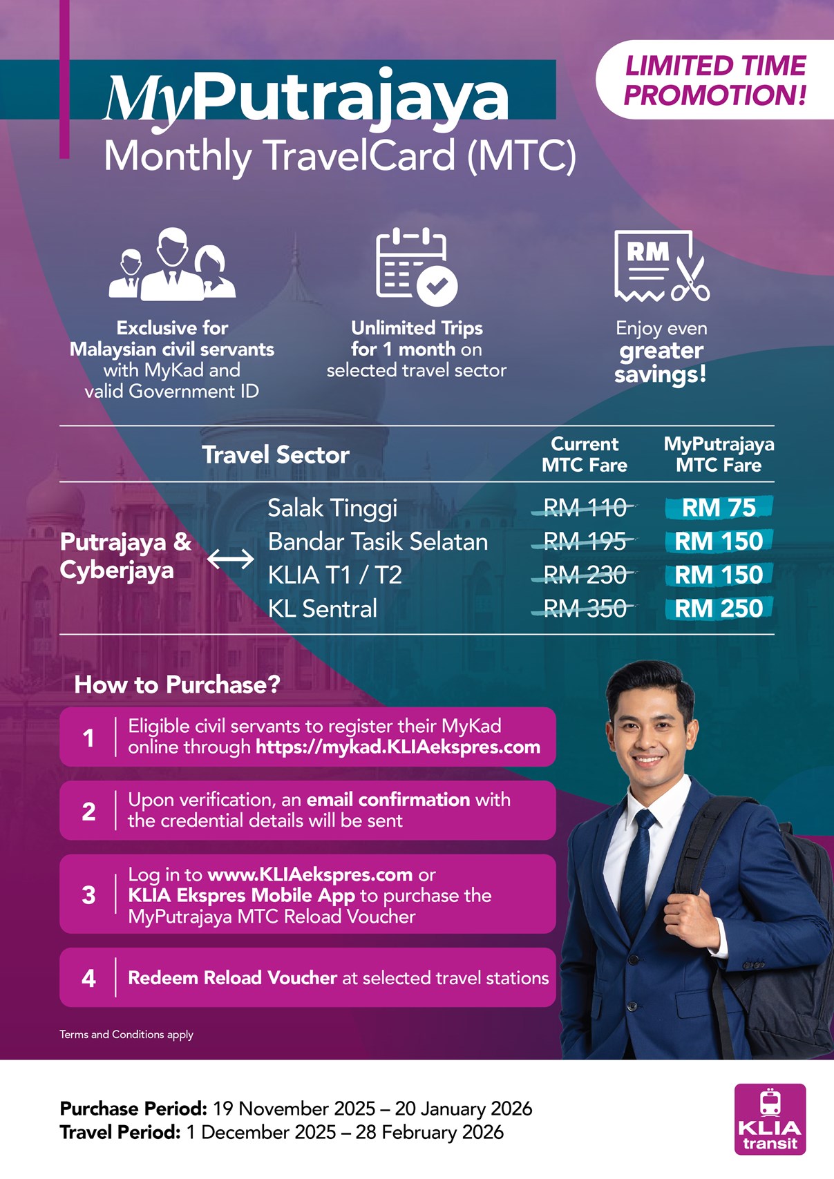 MyPutrajaya MTC is a special three (3) months promotion that offers discounted fare and unlimited travel on KLIA Transit for Malaysian civil servants commuting to and from Putrajaya. This promotion helps reduce daily travel costs by providing a more affordable commuting option for the public sector.